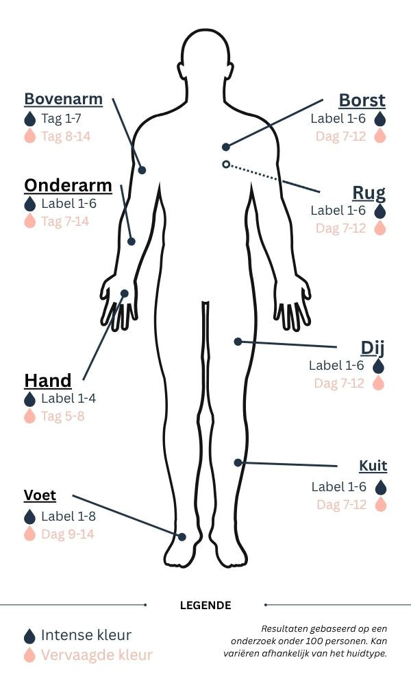 De kleur van je tattoo is volledig zichtbaar na 24–36 uur. Daarna blijft hij 1–2 weken zitten. De inkt vervaagt geleidelijk terwijl de huid zich natuurlijk vernieuwt.