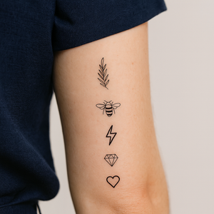 Wprowadź odrobinę natury i symboliki do swojego stylu dzięki zestawowi tatuaży Nature's Symbols. To wyjątkowe połączenie 5 wzorów -pszczoły, diamentu, serca, błyskawicy i liścia - oddaje elegancję, siłę i indywidualność. Niezależnie od tego, czy szukasz subtelnego dodatku, czy wyrazistego elementu, ten zestaw jest idealny na każdą okazję.